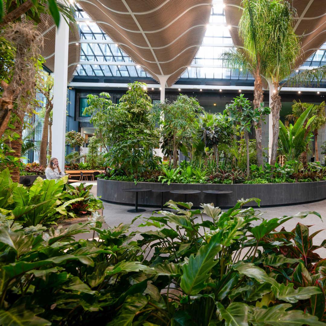 En indendørs skov bringer naturen ind i hotellets imponerende atrium, der, med et gulv af genbrugt beton, et akustisk loft lavet af genanvendt plastik, og vægpaneler fremstillet af genbrugte vinduesrammer, er særligt designet med fokus på upcycling og lavt ressourceforbrug.